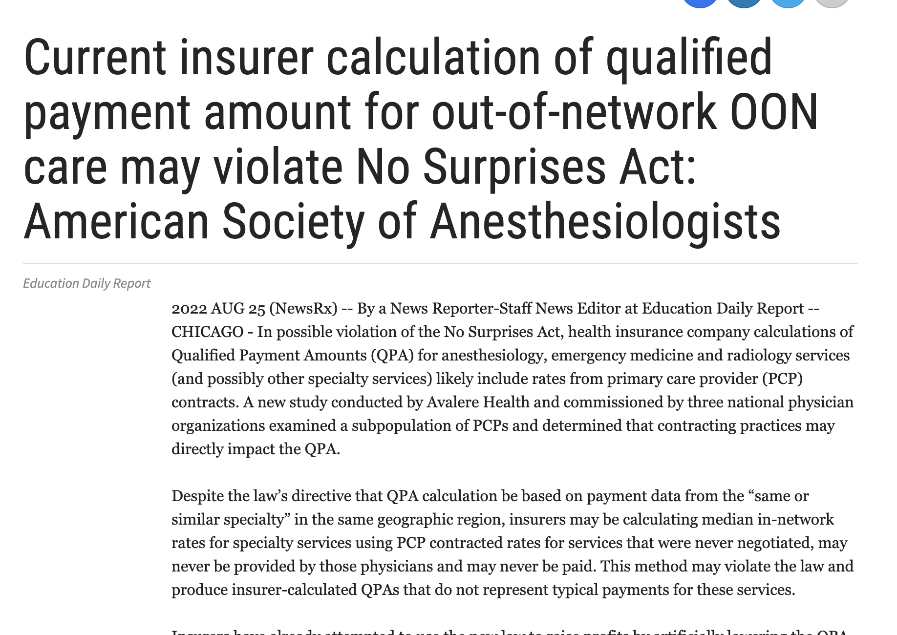 Current insurer calculation of qualified payment amount for out-of-network OON care may violate No Surprises Act: American Society of Anesthesiologists