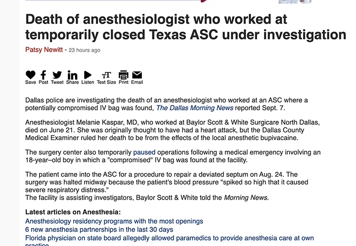 Anesthesiologist Melanie Kaspar, MD died on June 21. She was originally thought to have had a heart attack, but the Dallas County Medical Examiner ruled her death to be from the effects of the local anesthetic bupivacaine. The surgery center also temporarily paused operations following a medical emergency involving an 18-year–old boy in which a “compromised” IV bag was found at the facility.
