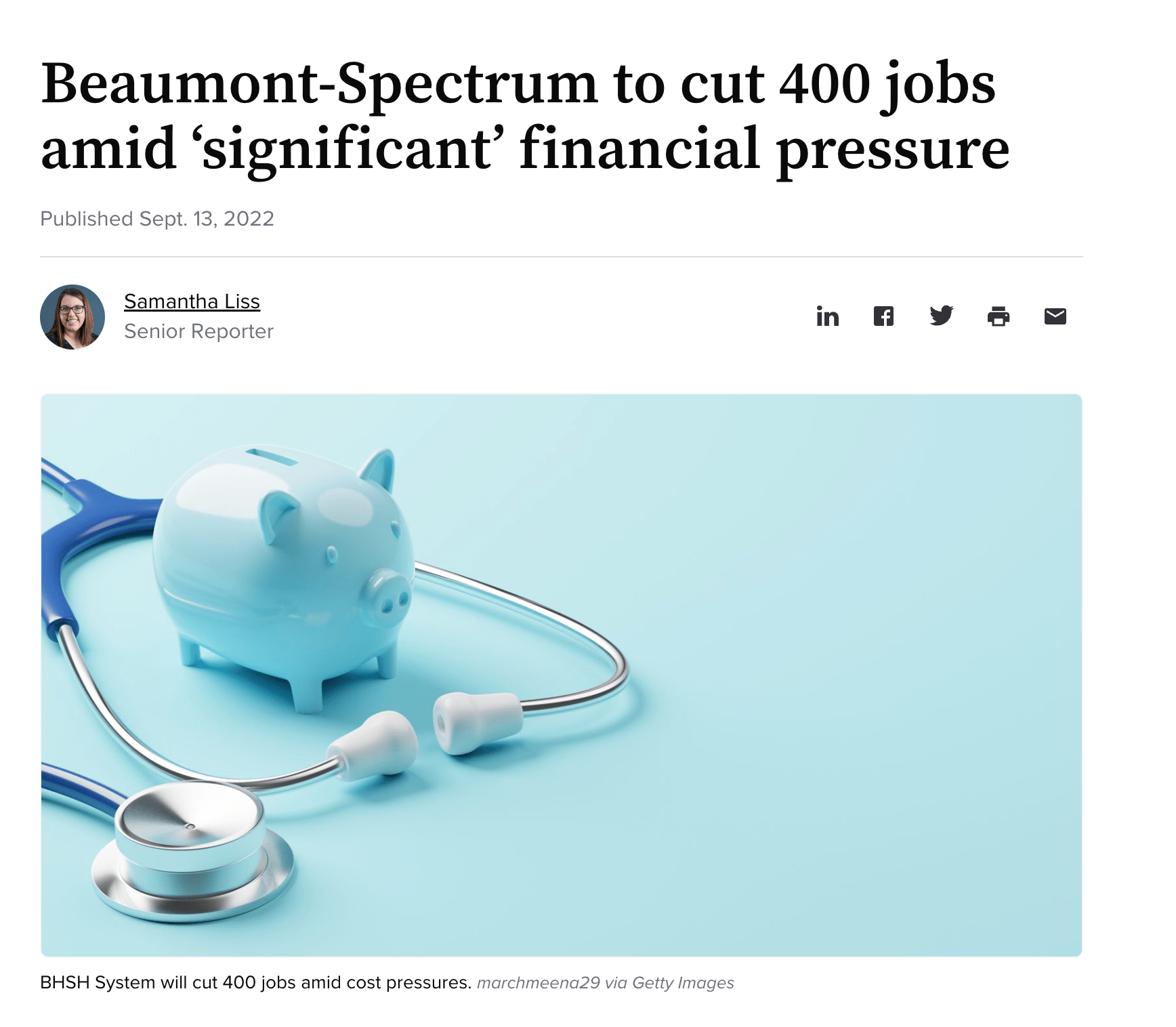 Stay in the Know: Beaumont Health and Spectrum Health, now BHSH System, plan to cut 400 jobs as the Michigan health system faces “significant financial pressures,” the system told Healthcare Dive.