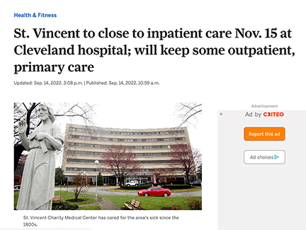 St. Vincent to Close to Inpatient Care Nov. 15 at Cleveland Hospital; Will Keep Some Outpatient, Primary Care