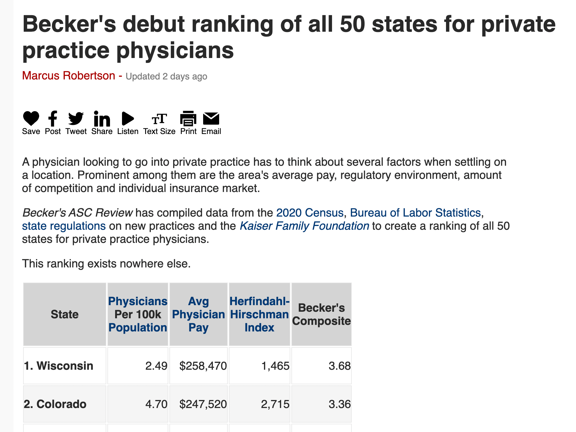 Becker’s ASC Review has compiled data from the 2020 CensusBureau of Labor Statisticsstate regulations on new practices and the Kaiser Family Foundation to create a ranking of all 50 states for private practice physicians.