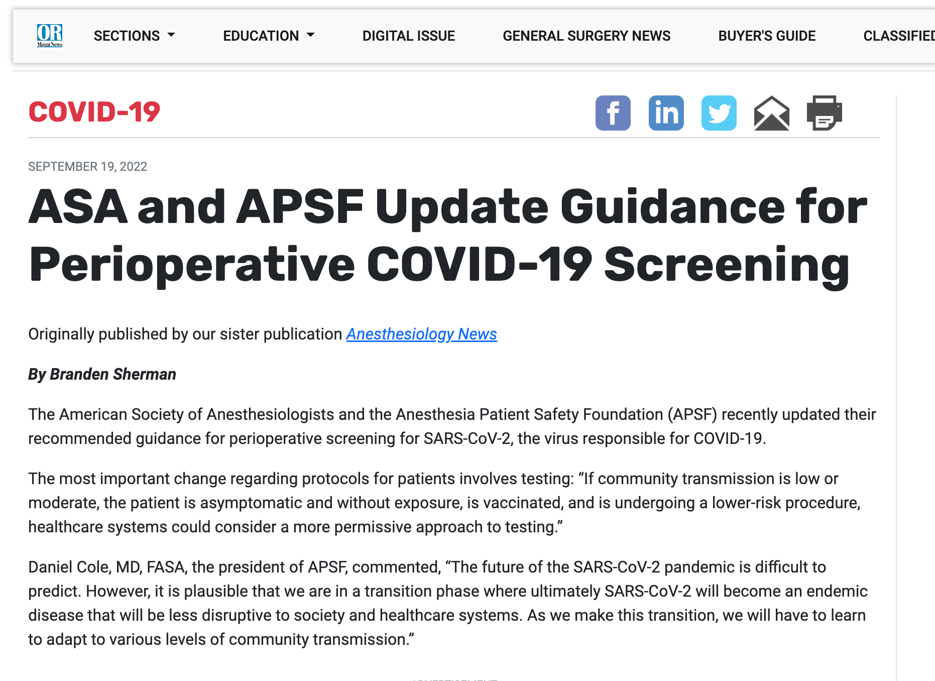 The American Society of Anesthesiologists and the Anesthesia Patient Safety Foundation (APSF) recently updated their recommended guidance for perioperative screening for SARS-CoV-2, the virus responsible for COVID-19.