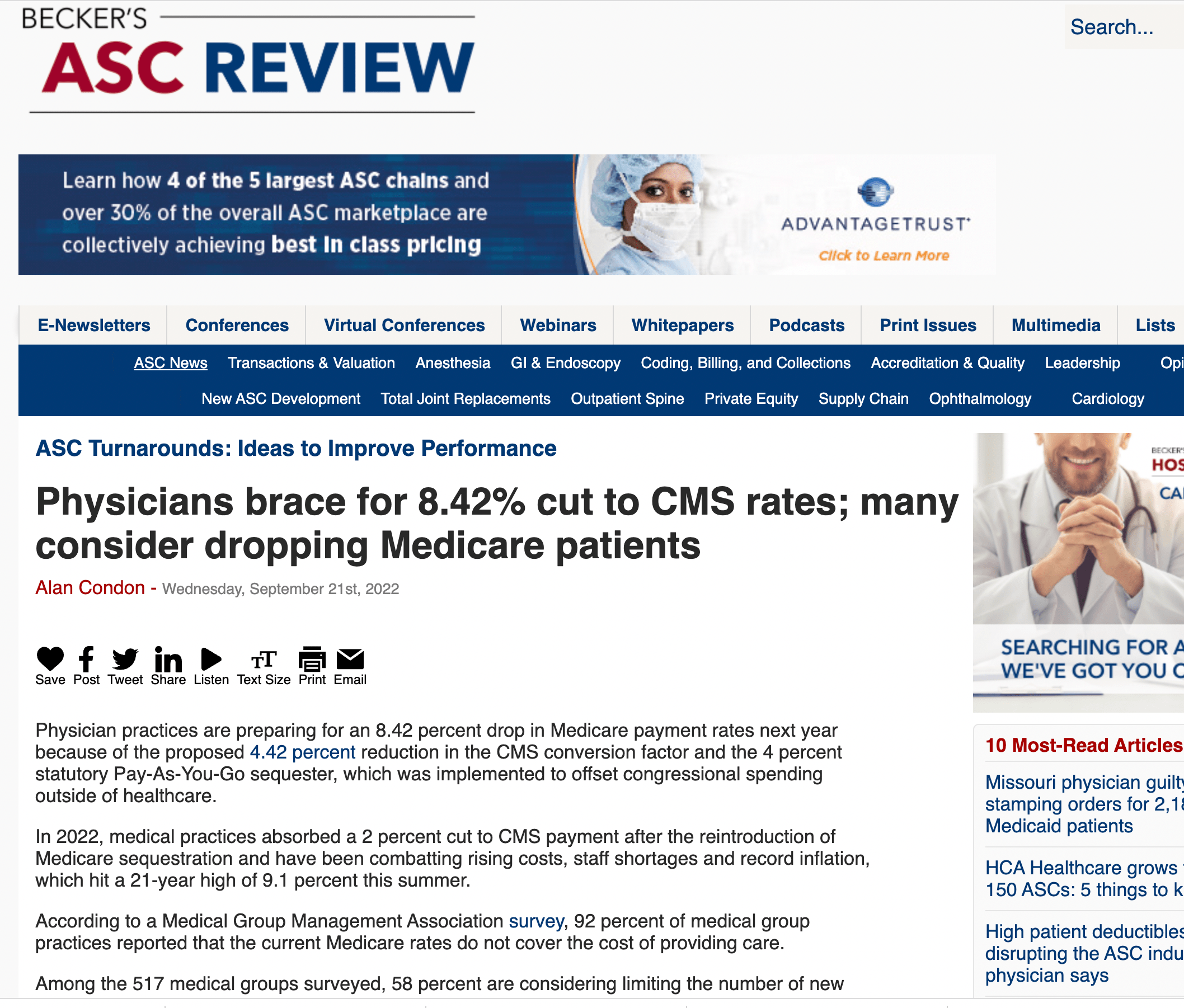 Physician practices are preparing for an 8.42 percent drop in Medicare payment rates next year because of the proposed 4.42 percent reduction in the CMS conversion factor and the 4 percent statutory Pay-As-You-Go sequester, which was implemented to offset congressional spending outside of healthcare.