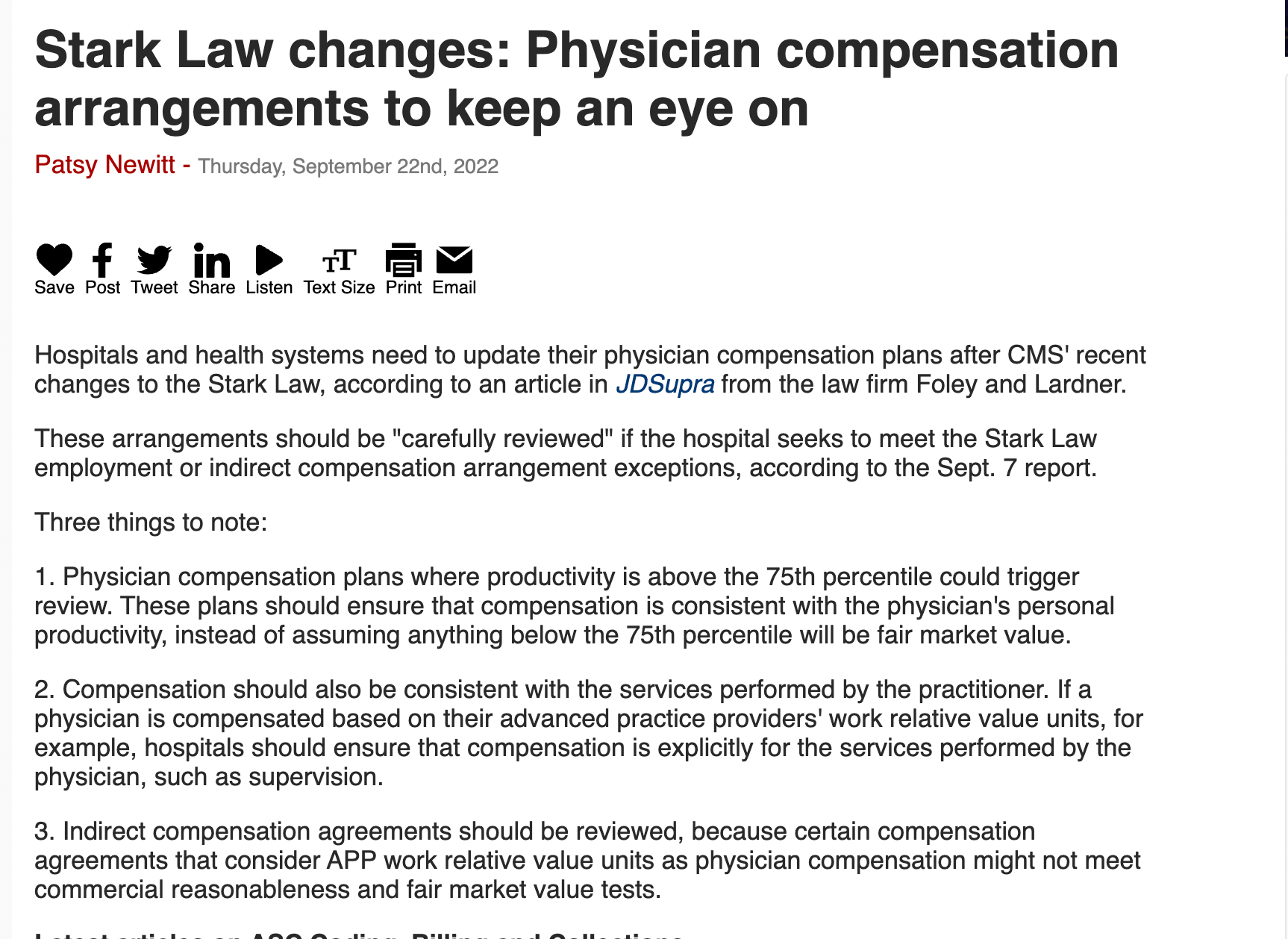 Stay in the Know: Hospitals and health systems need to update their physician compensation plans after CMS’ recent changes to the Stark Law, according to an article in JDSupra from the law firm Foley and Lardner.