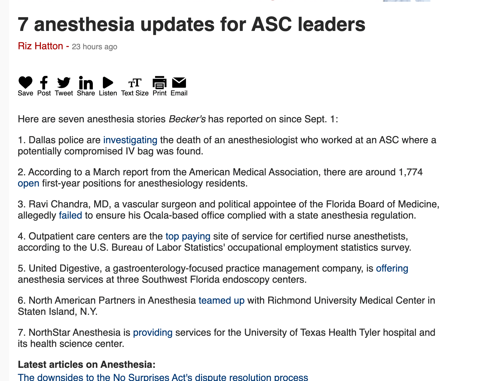 Here are seven anesthesia stories Becker’s has reported on since Sept. 1: