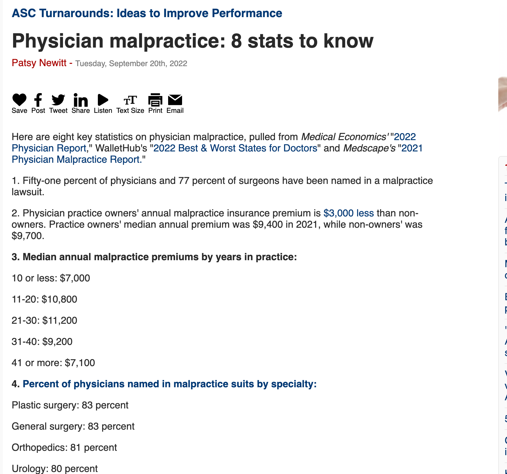Here are eight key statistics on physician malpractice, pulled from Medical Economics’ “2022 Physician Report,” WalletHub’s “2022 Best & Worst States for Doctors” and Medscape’s “2021 Physician Malpractice Report.”