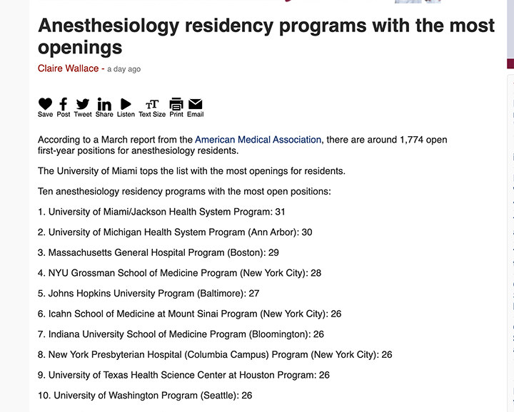 Stay in the Know: According to a report from the American Medical Association, there are around 1,774 open first-year positions for anesthesiology residents. The University of Miami tops the list with the most openings for residents.